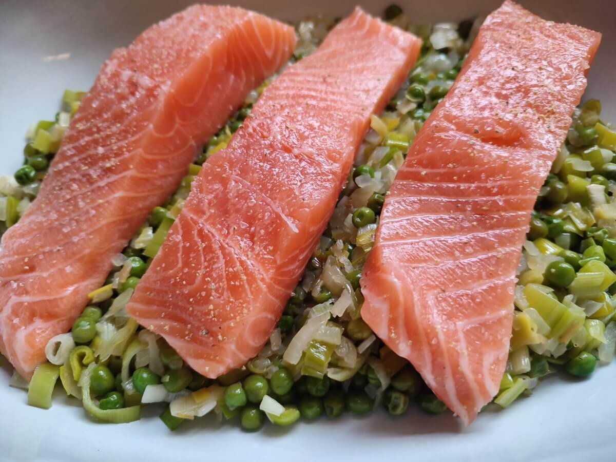Ovenschotel met zalm en bloemkoolpuree groene groentjes