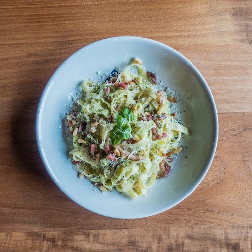 salade van meloen pecannoten, seranoham, basilicumdressing en gorgonzola