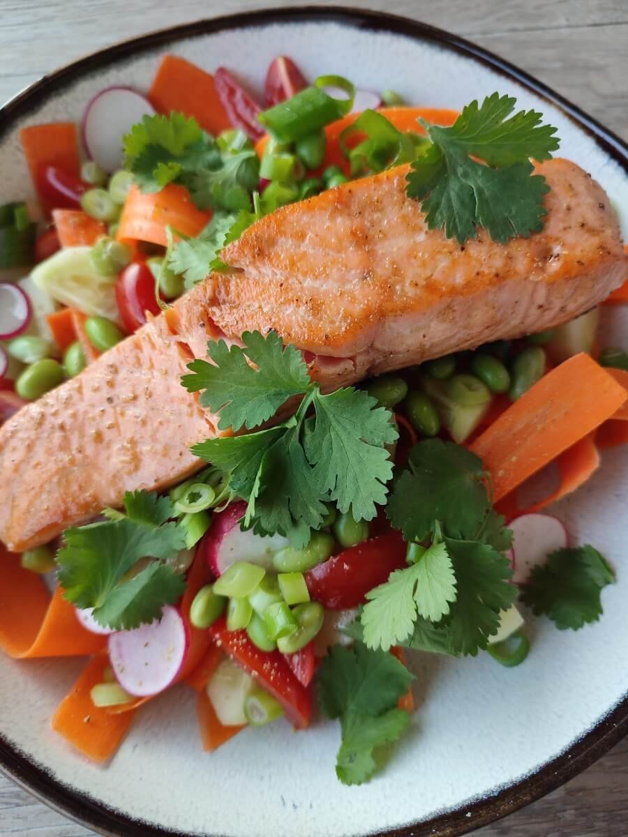Bloemkoolrijst met groentjes en gebakken zalm