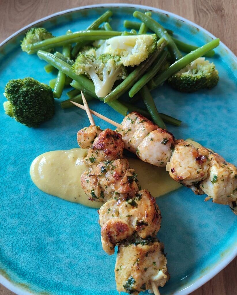 Kippenhaas brochette met groene groenten en mango-saus