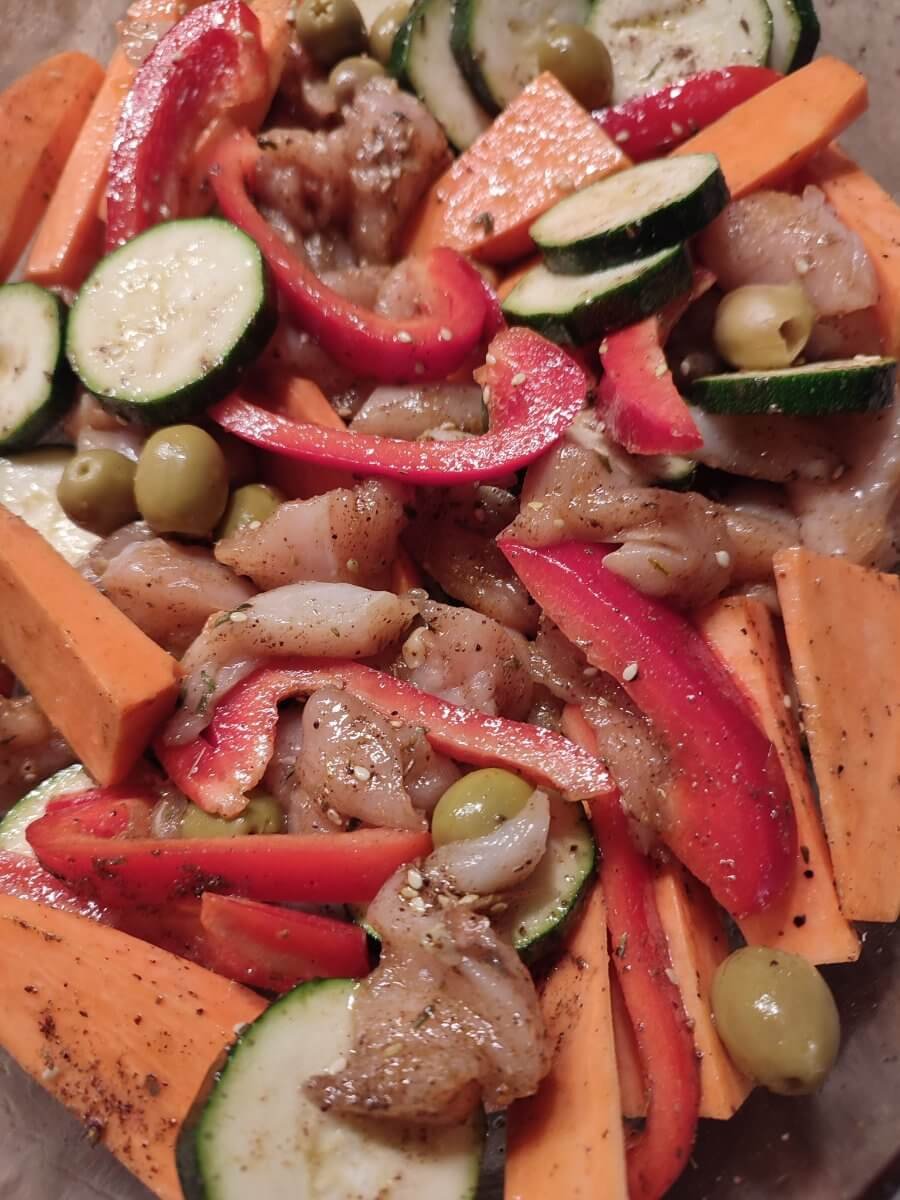 Ovenschotel met kip, zoete aardappel en sriracha mayonaise
