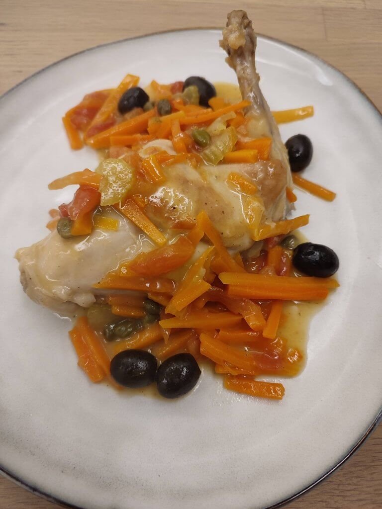 Konijn met worteltjes en olijven