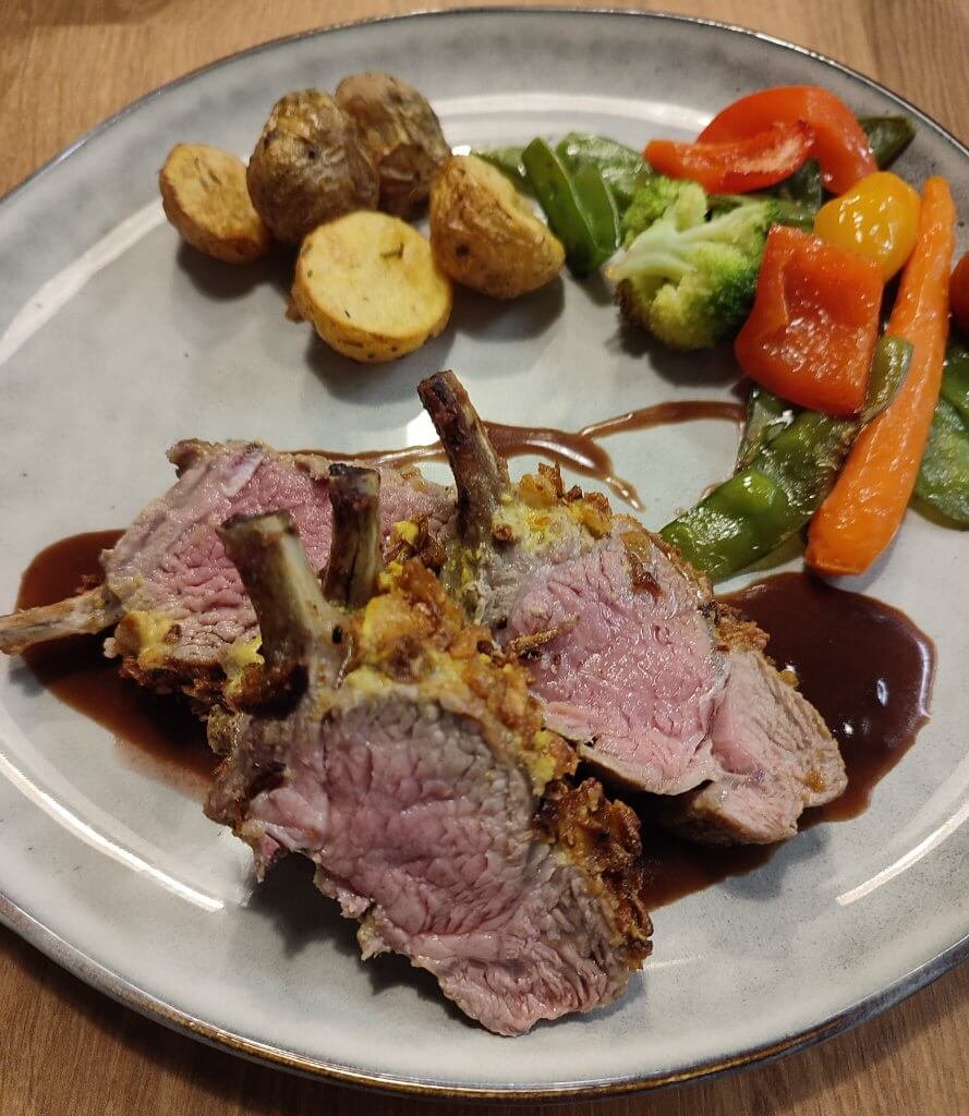 Lamskroon met een korstje en veel groentjes