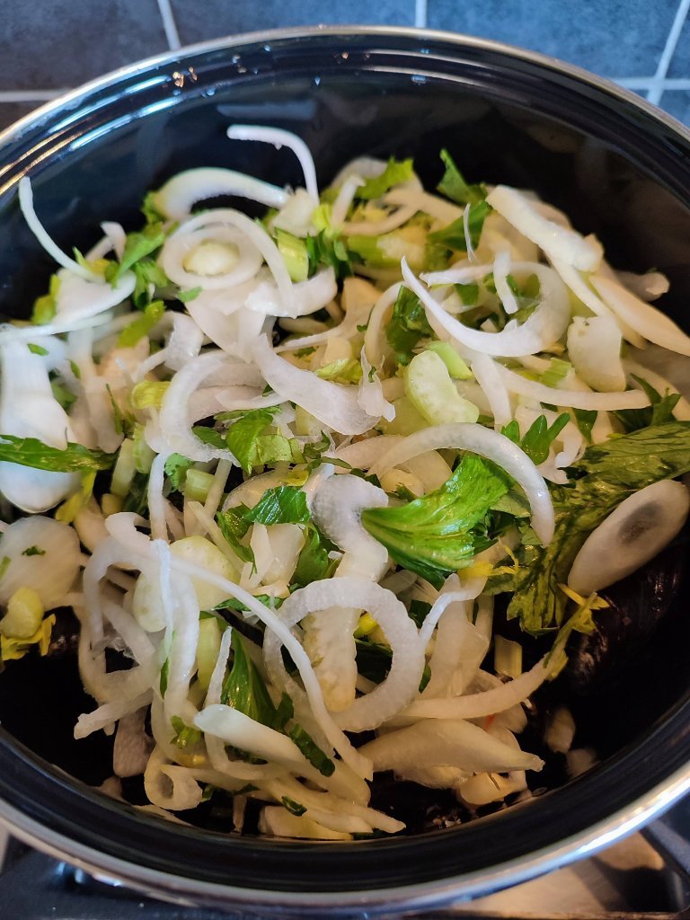 Mosselen natuur in de pot met groenten