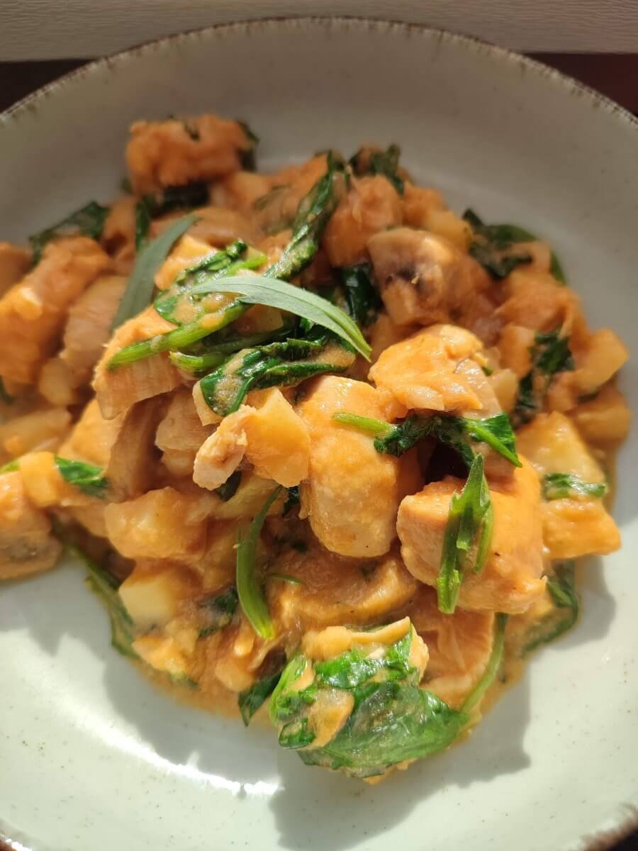 Curry met scampi’s, erwtjes, paprika, mango en munt