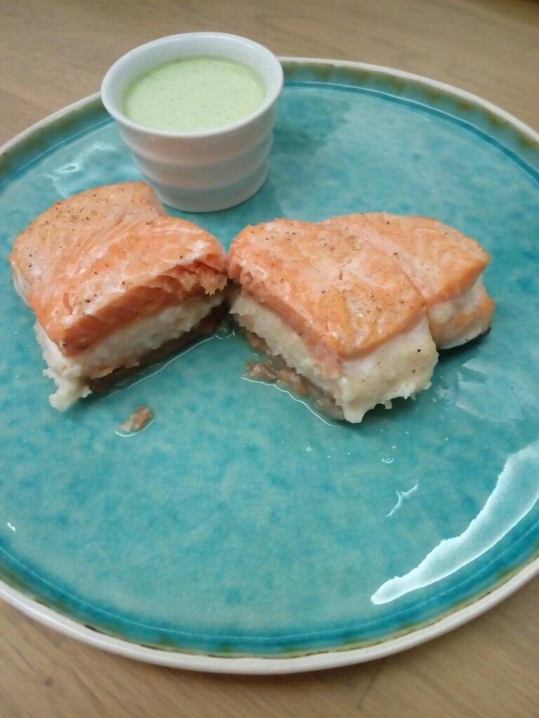 gevulde zalm met scampi en vruchten