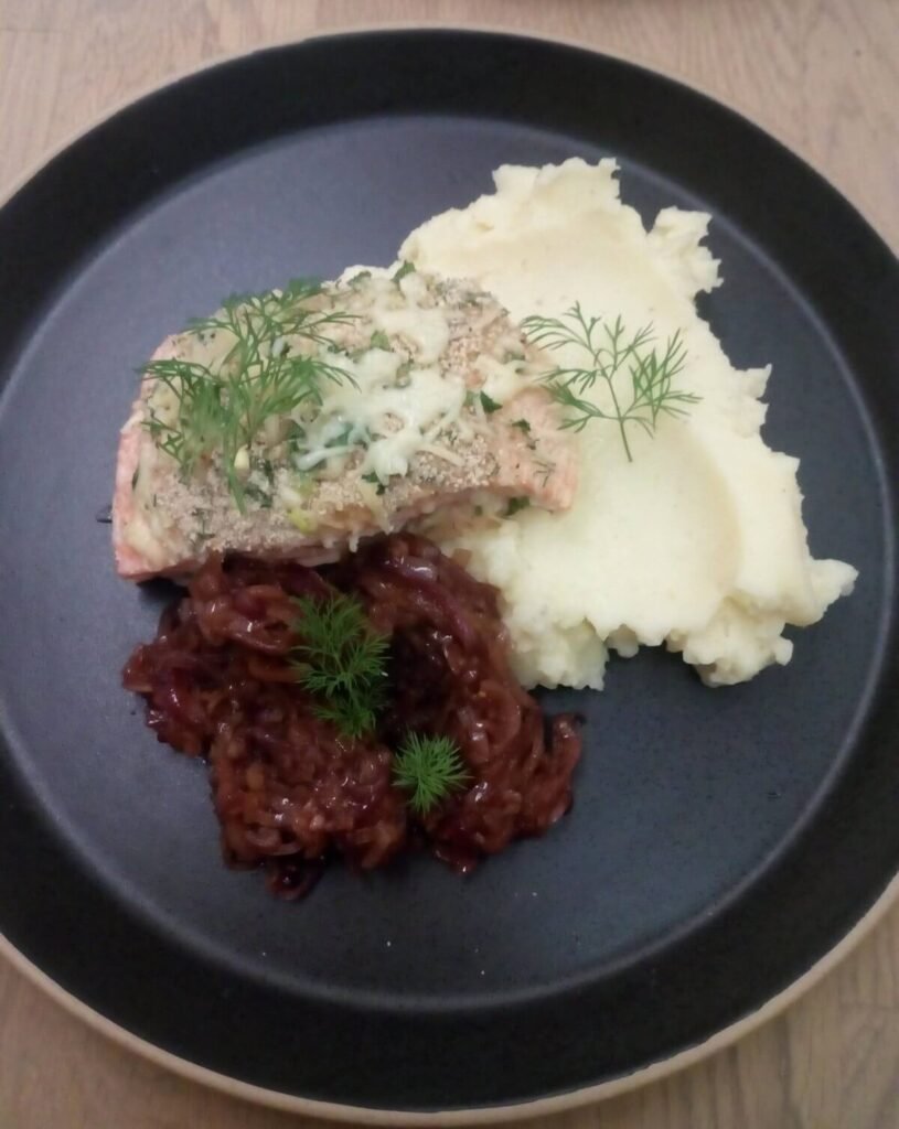 Gevulde zalm met kaas en compote van sjalot