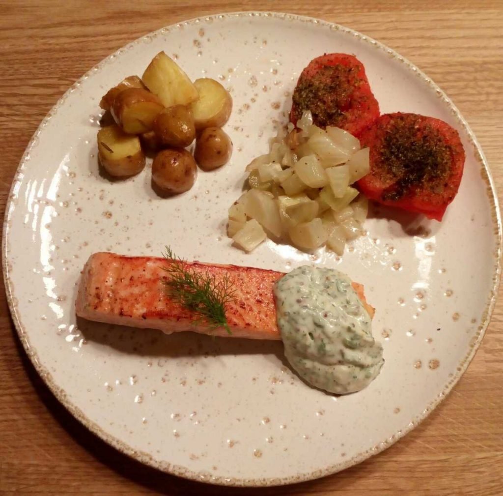gebakken zalm met kruidige zure room, krieltjes, venkel en tomaatjes