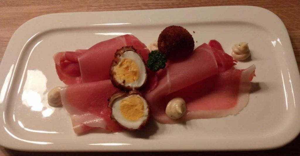 gefrituurde kwarteleitjes met gedroogde ham en truffelmayonaise