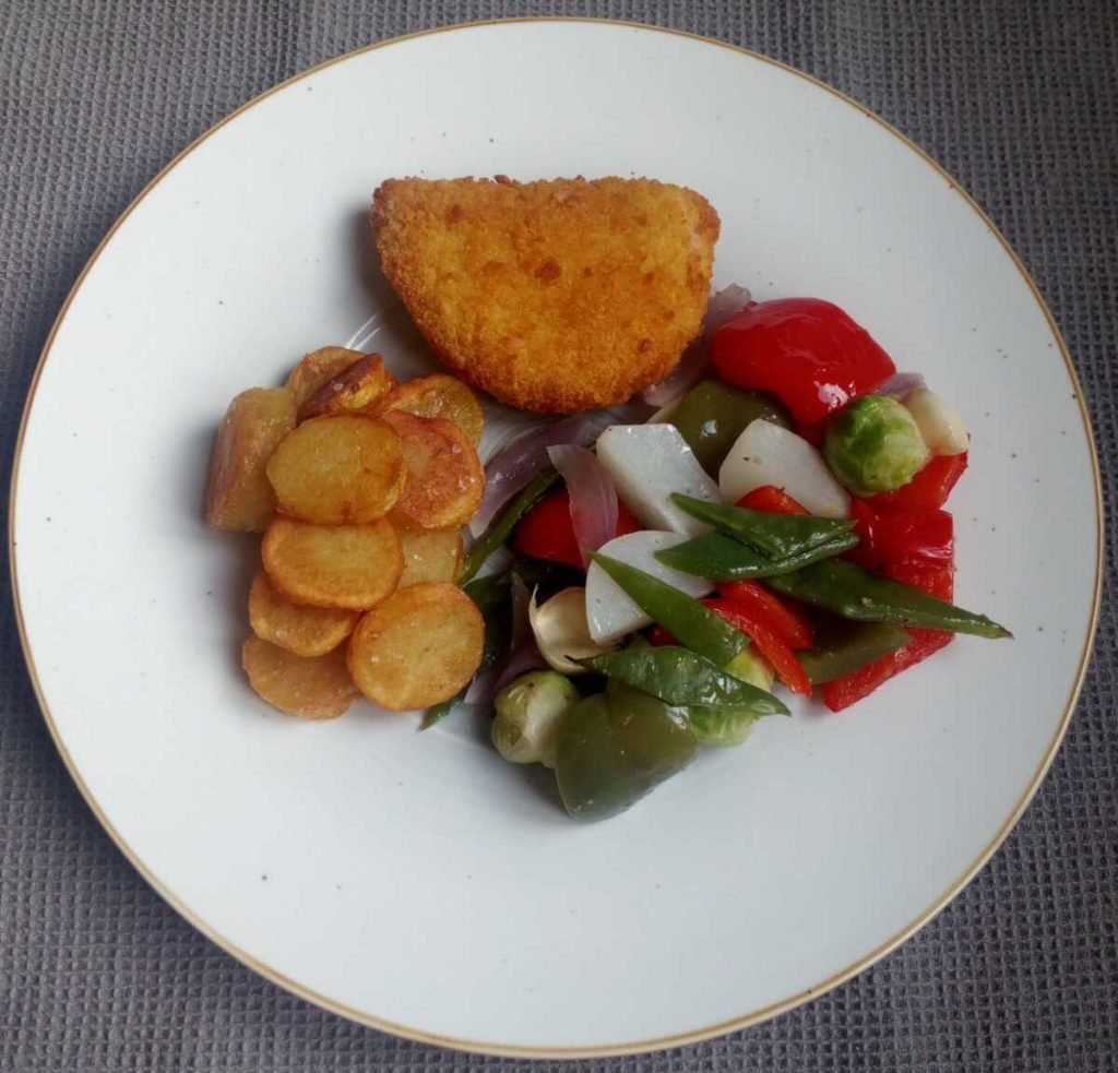 cordon blue, ovengroentjes en gebakken aardappelschijfjes