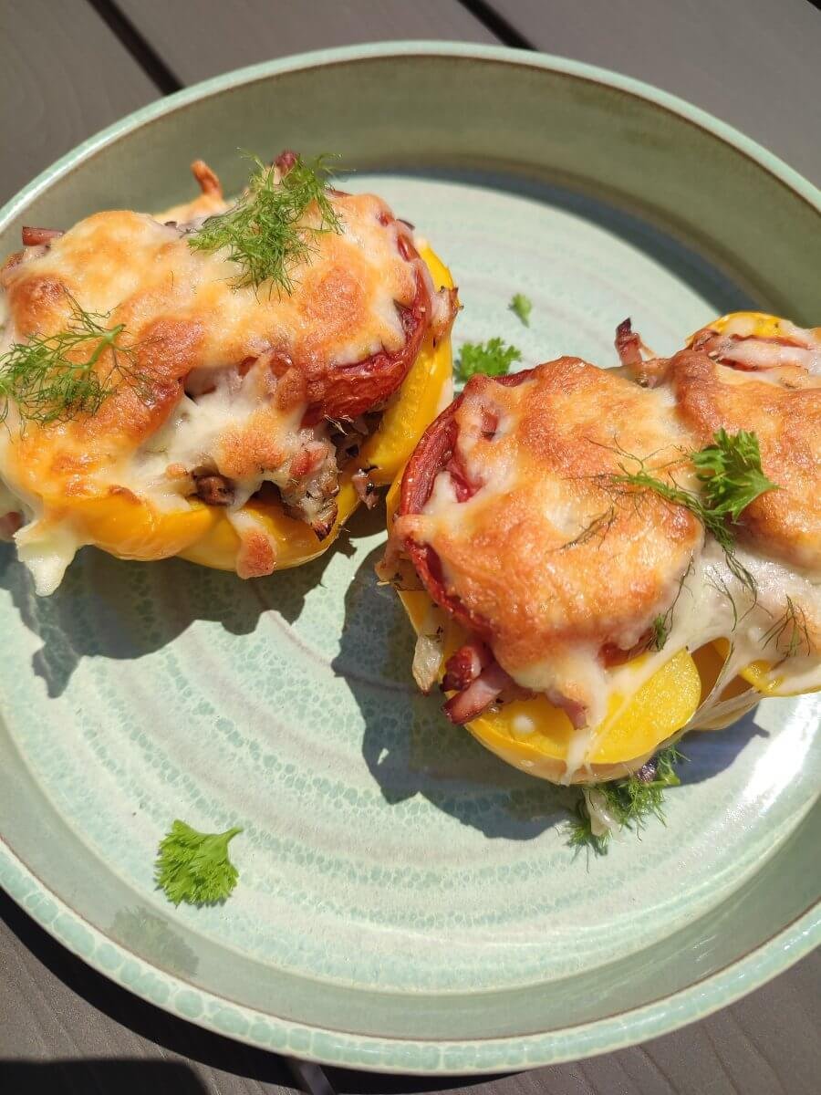 Gevulde paprika’s met hamblokjes, groentjes en kaas