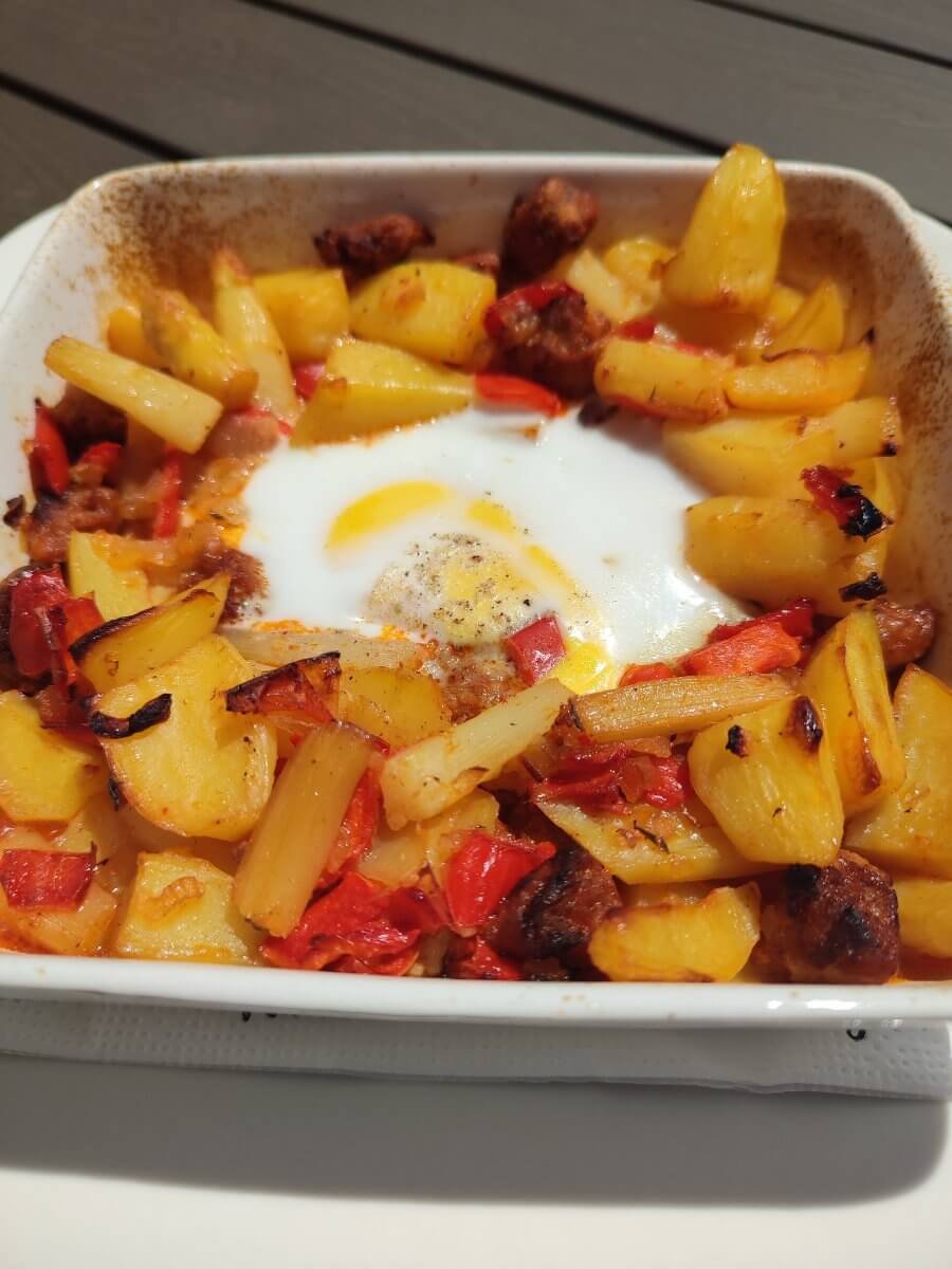 Ovenschoteltje met asperges en chorizo