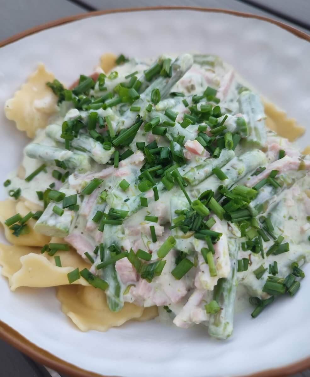 Ravioli met groene asperges, kruidenkaas en hamblokjes