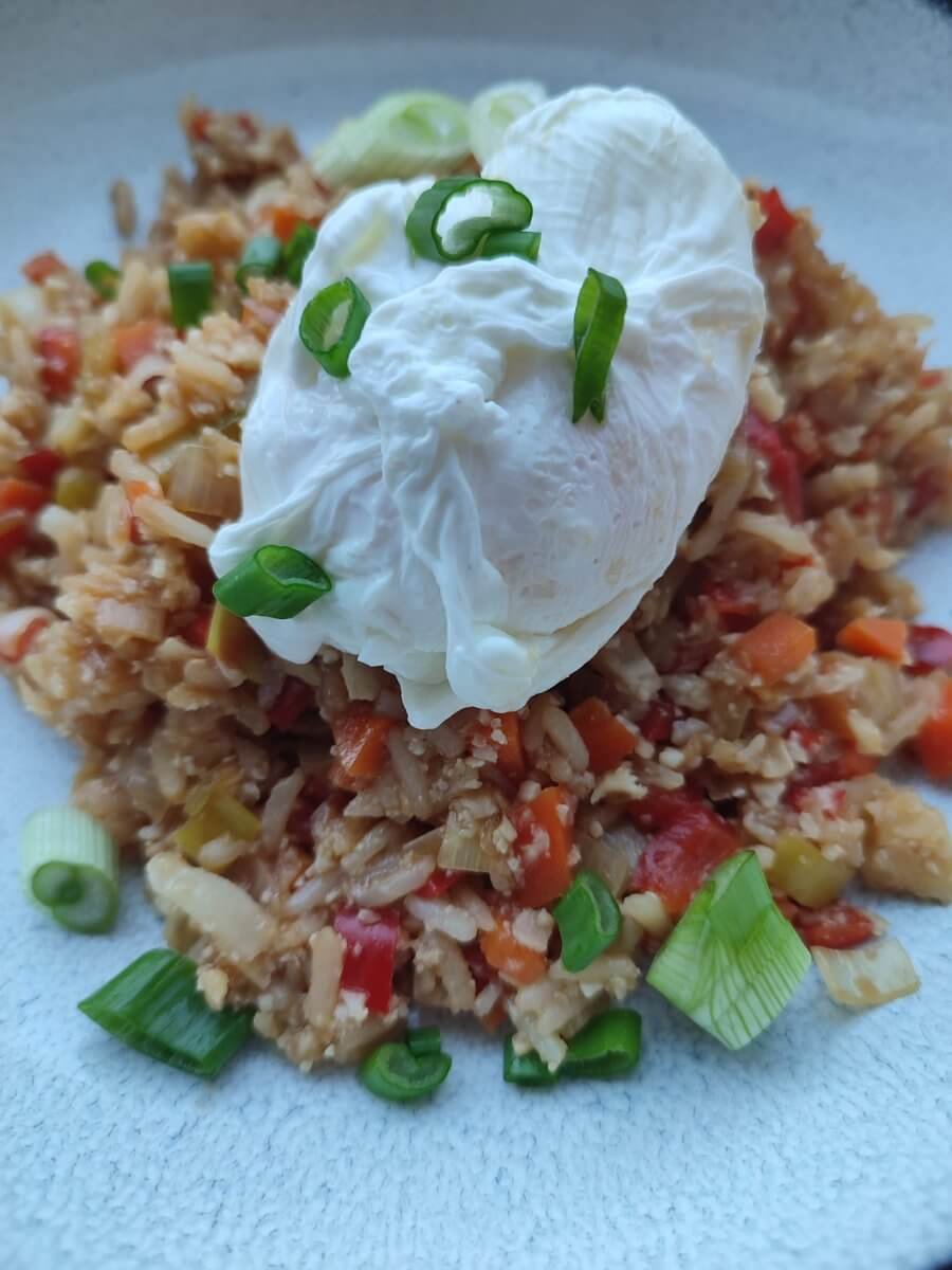 Vegetarische wok met een gepocheerd eitje