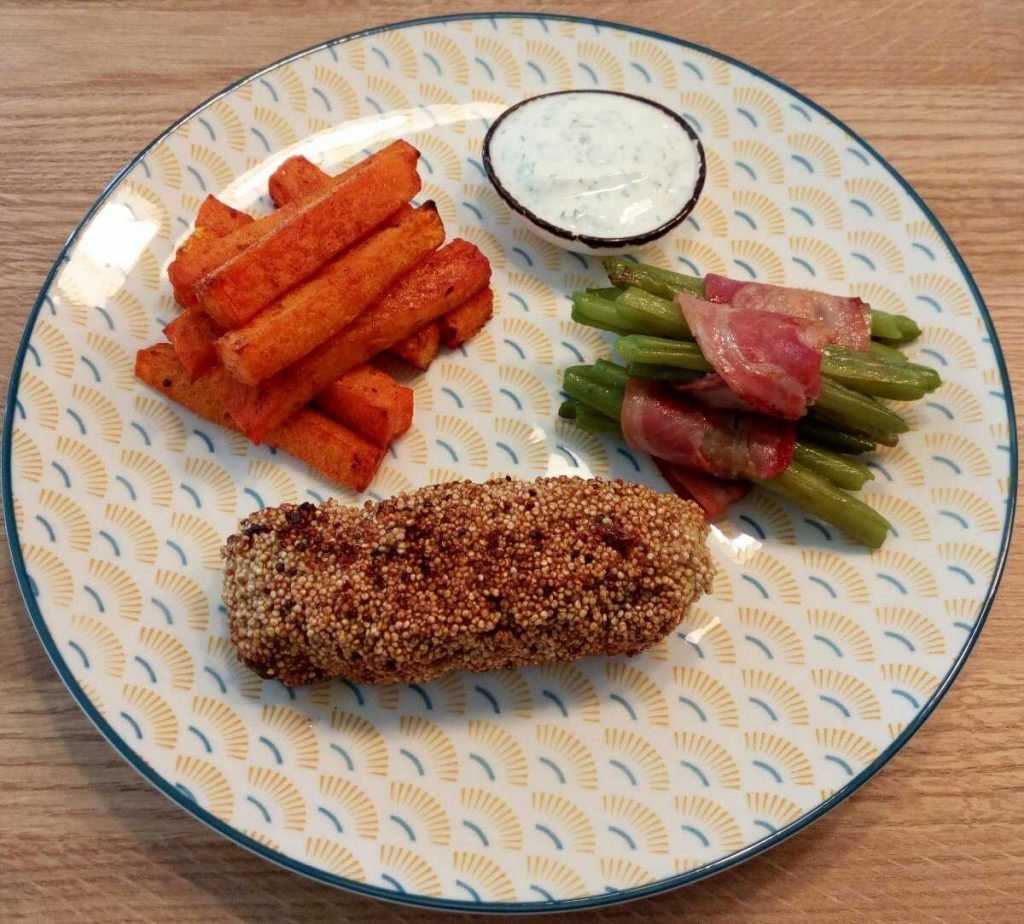 Kalkoenrolletje in een krokant jasje met pompoenfrietjes