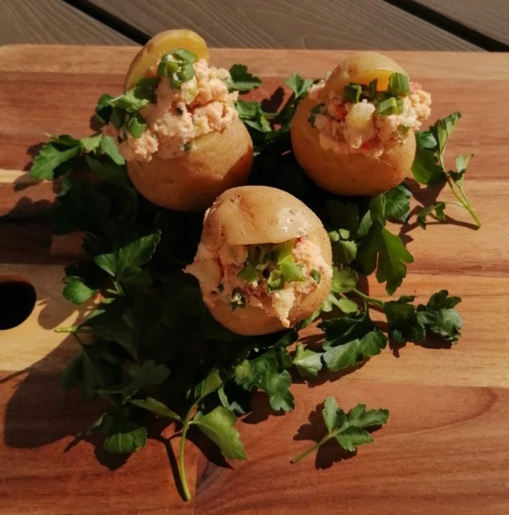 Gevulde aardappeltjes met kipsalade samen