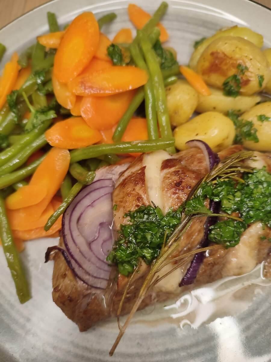 Hasselback varkenshaasje met lentegroentjes in de wok