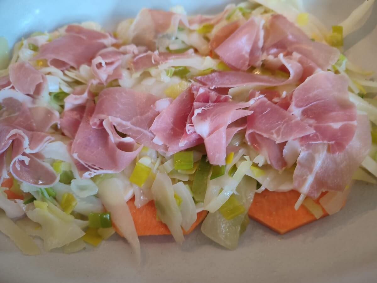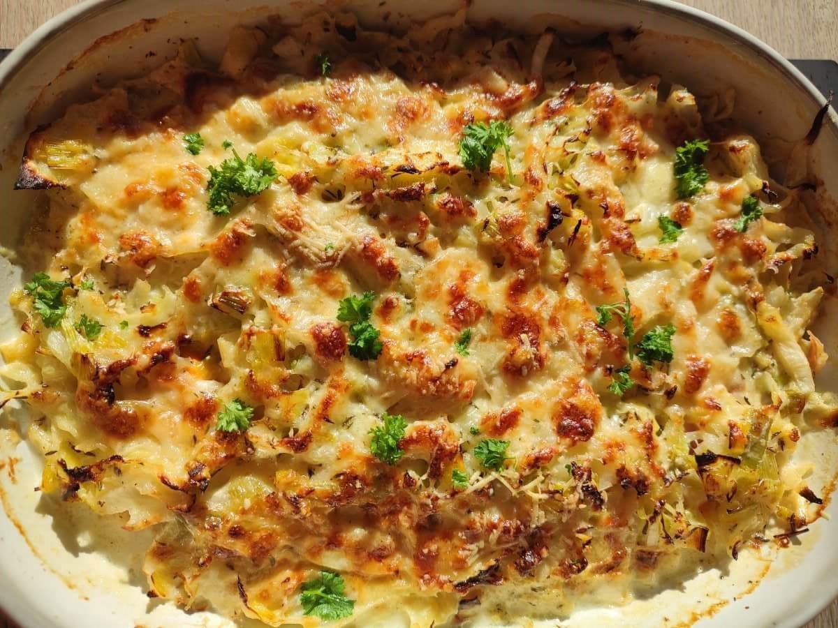 Ovenschotel met zoete aardappel en witte kool gebakken