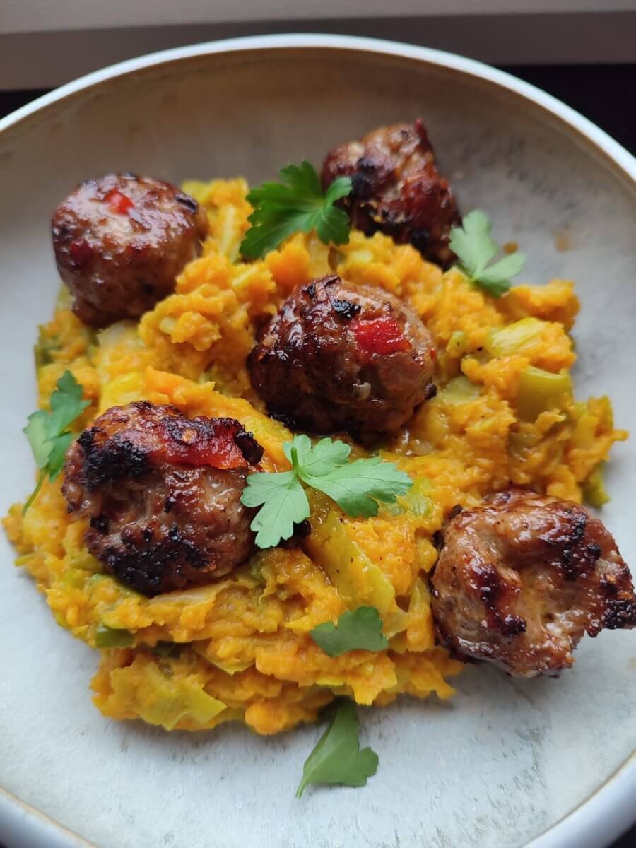 Stoemp van zoete aardappelen met gehaktballetjes