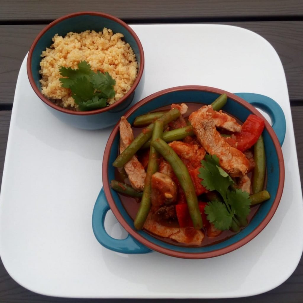 Couscous van linzen en kikkererwten met pikante varkensreepjes