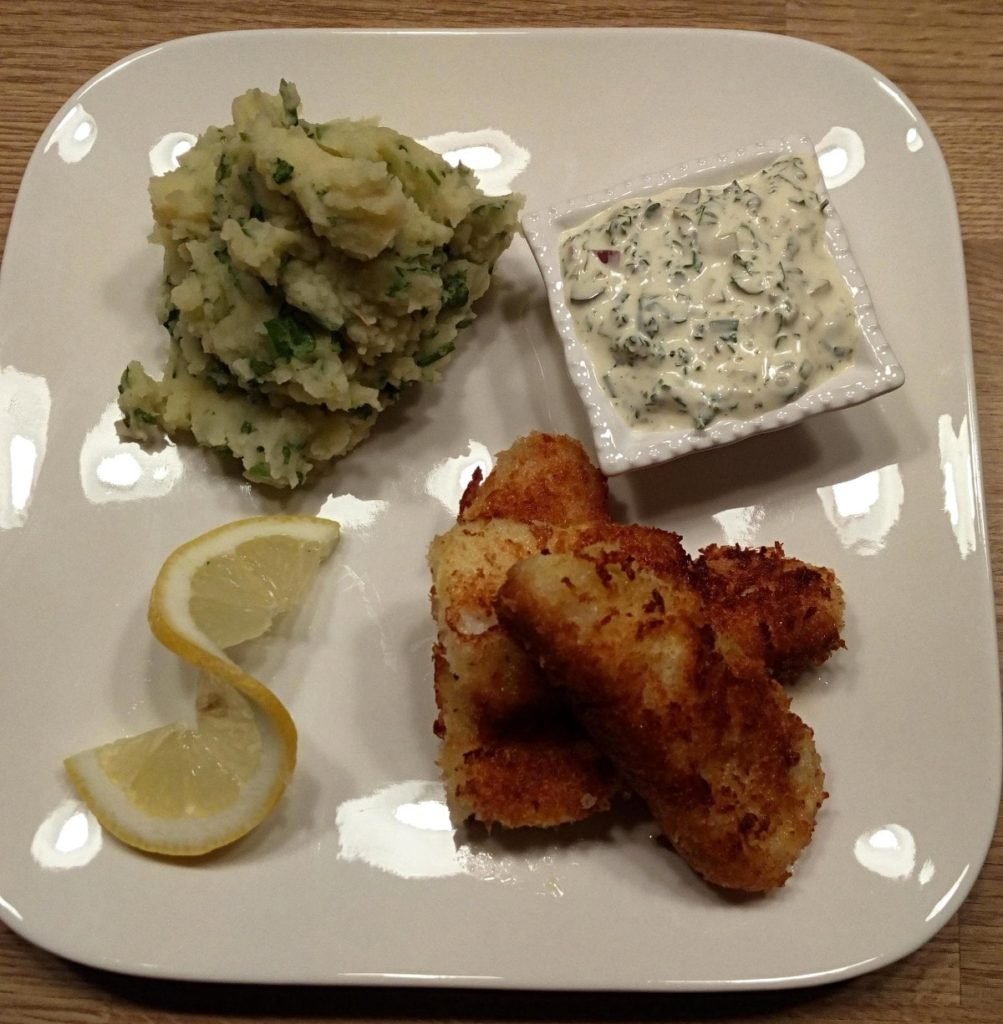 Zelfgemaakte fishsticks met kruidige puree