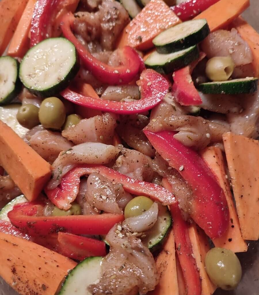 Ovenschotel met kip, zoete aardappel en sriracha mayonaise