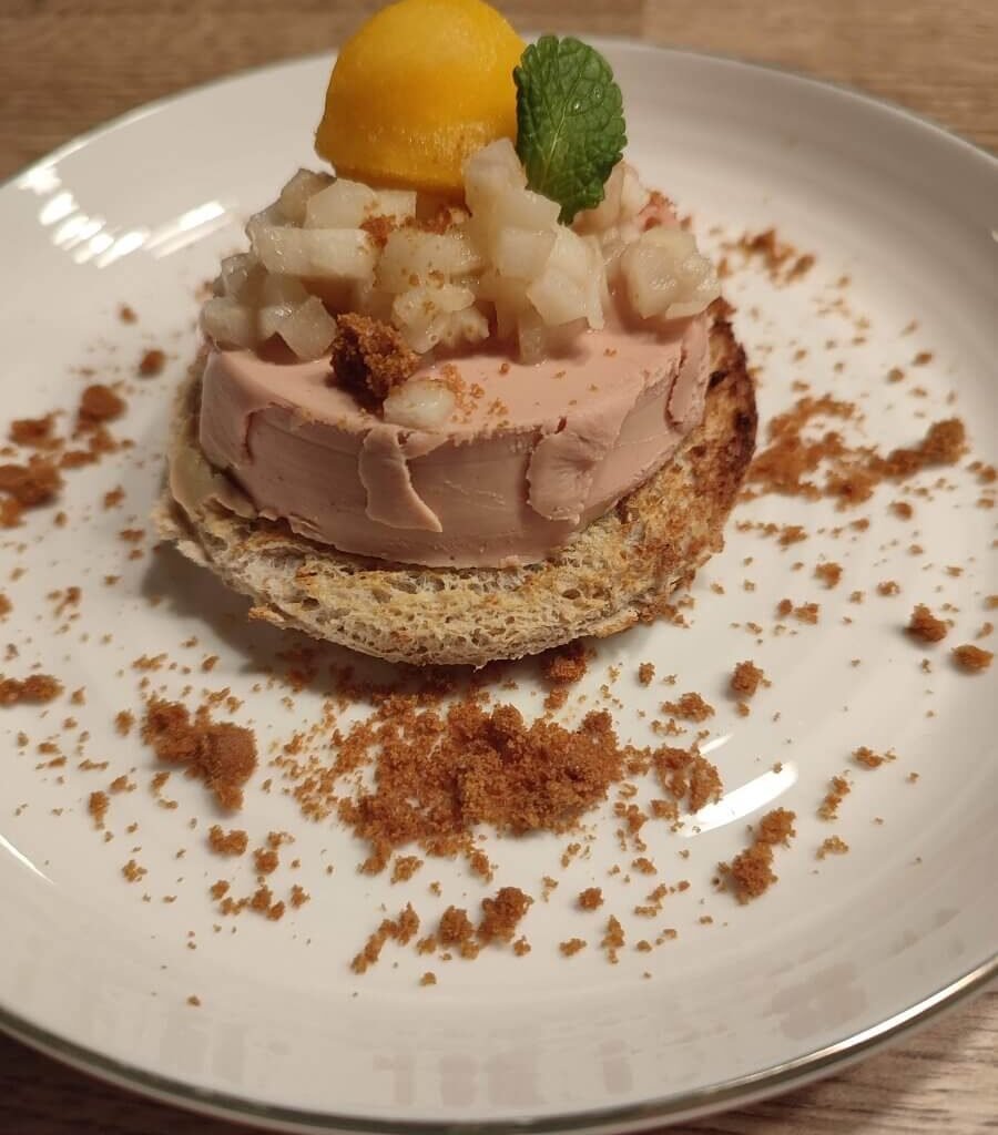 Toast met foie gras, gebakken peer en kaki