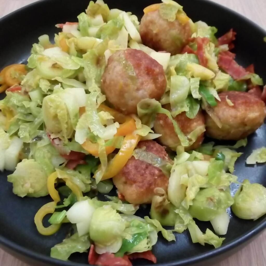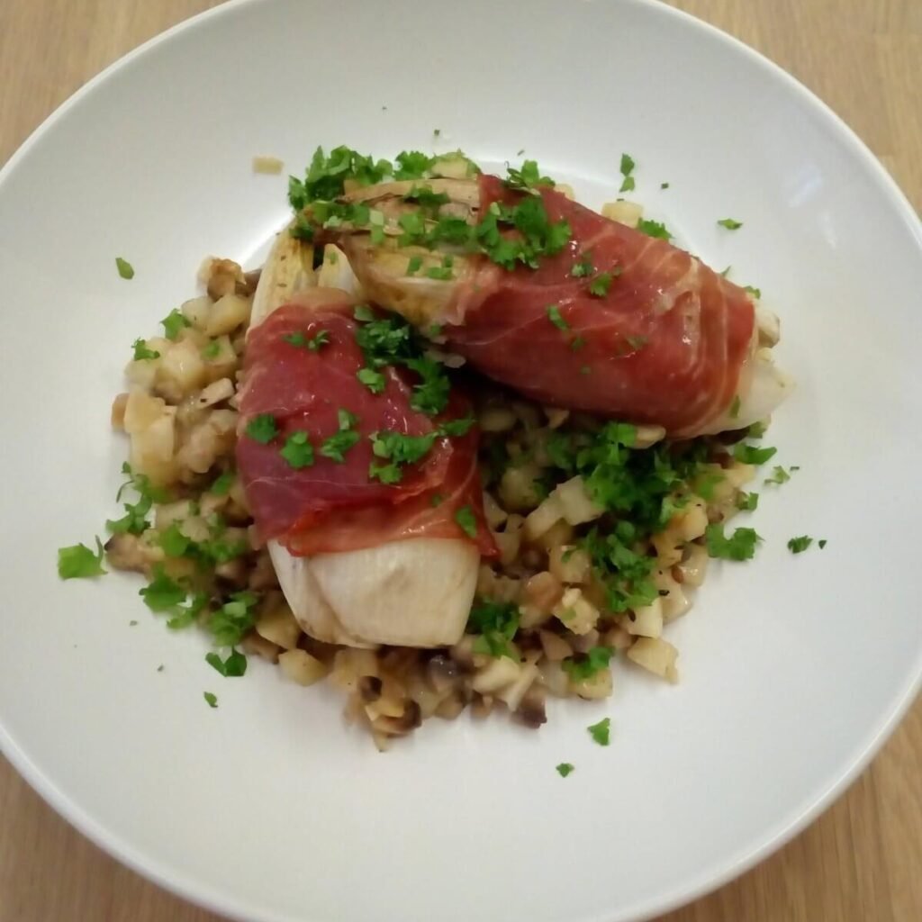 Gevuld witloof met kalfsgehakt en brunoise van champignons en knolselder