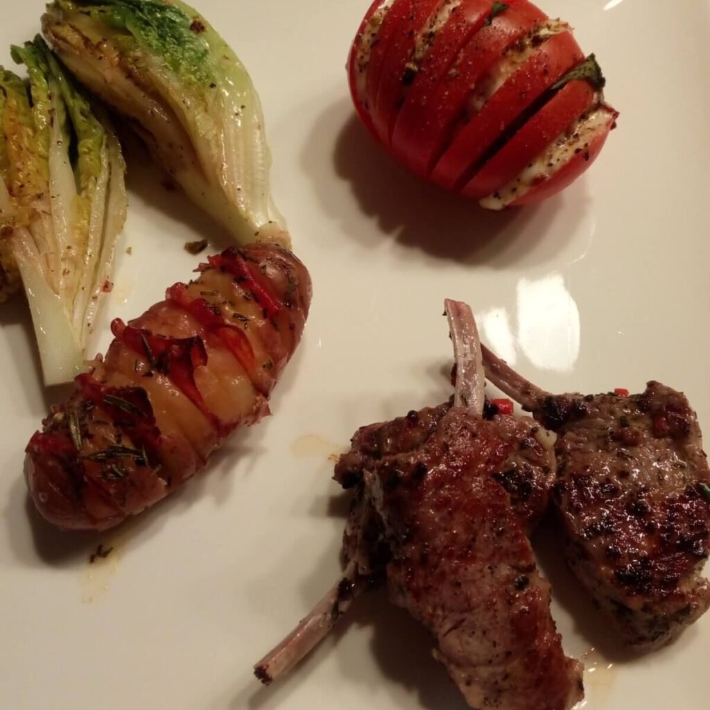 Gemarineerde lamskroon, gebakken slaharten, tomaatjes met mozzarella en hasselbackaardappelen