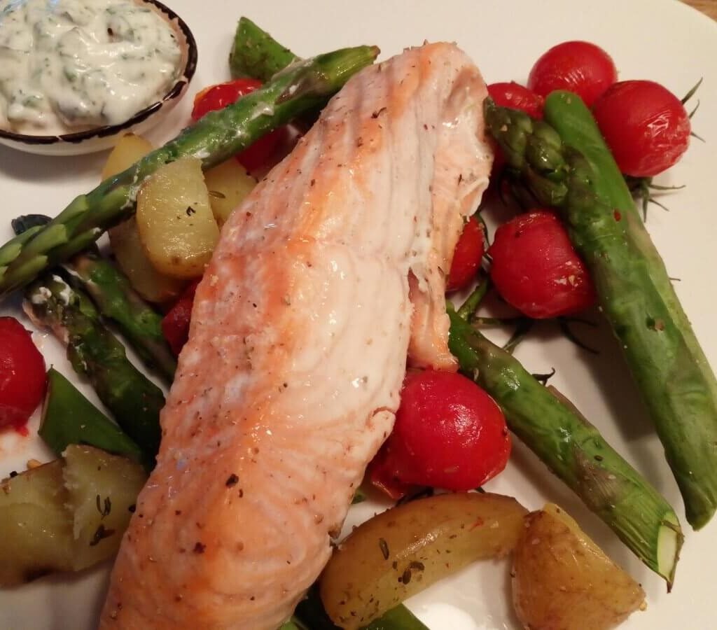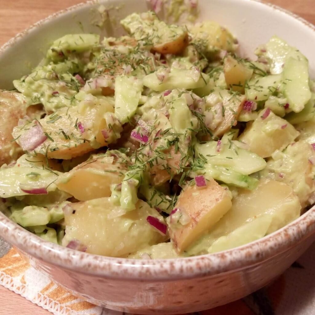 Zalmbrochette, aardappelsalade met avocado-dressing