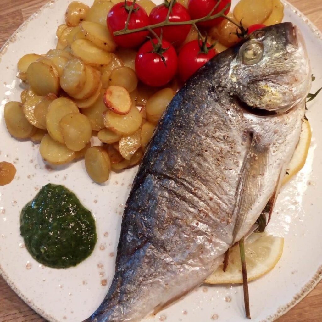 Dorade met fijne aardappelschijfjes en een salsa van courgette