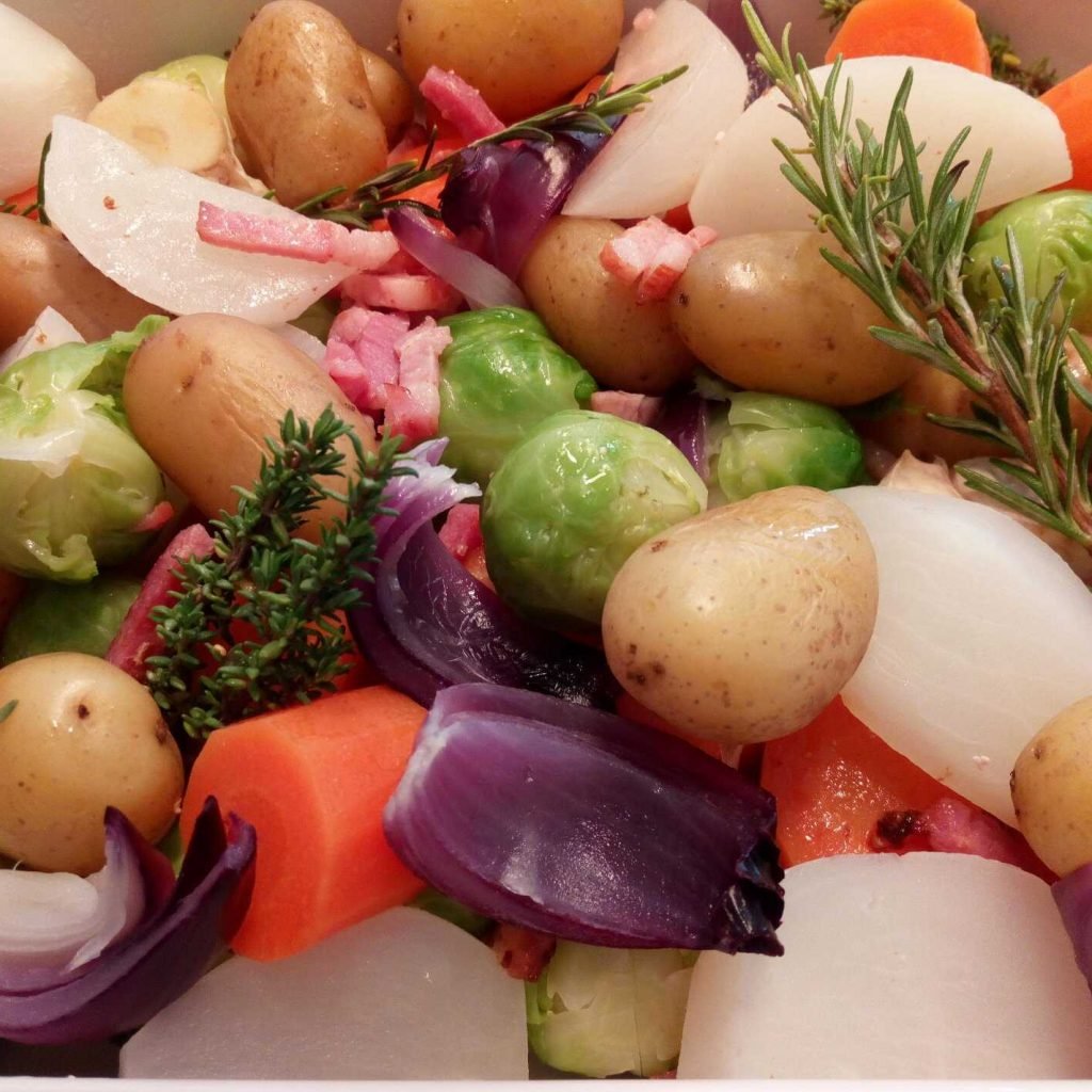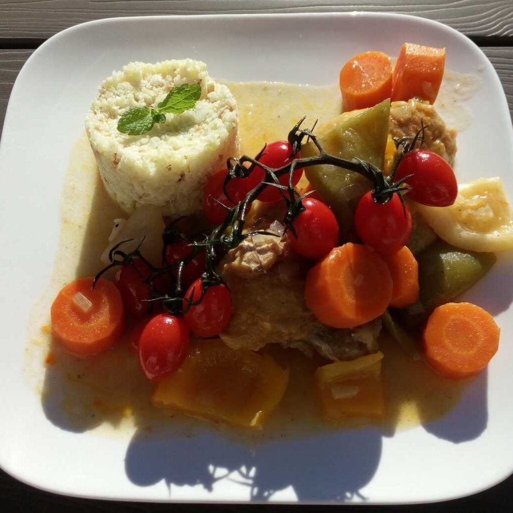 Kippendijen met ras-el-hanout, groentjes en bloemkoolrijst