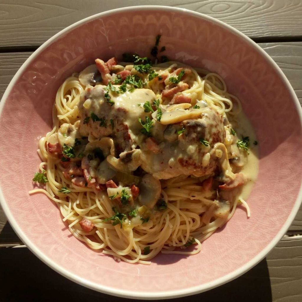 Kippenvinken in romige champignonsaus met pasta/paupiettes de poulet