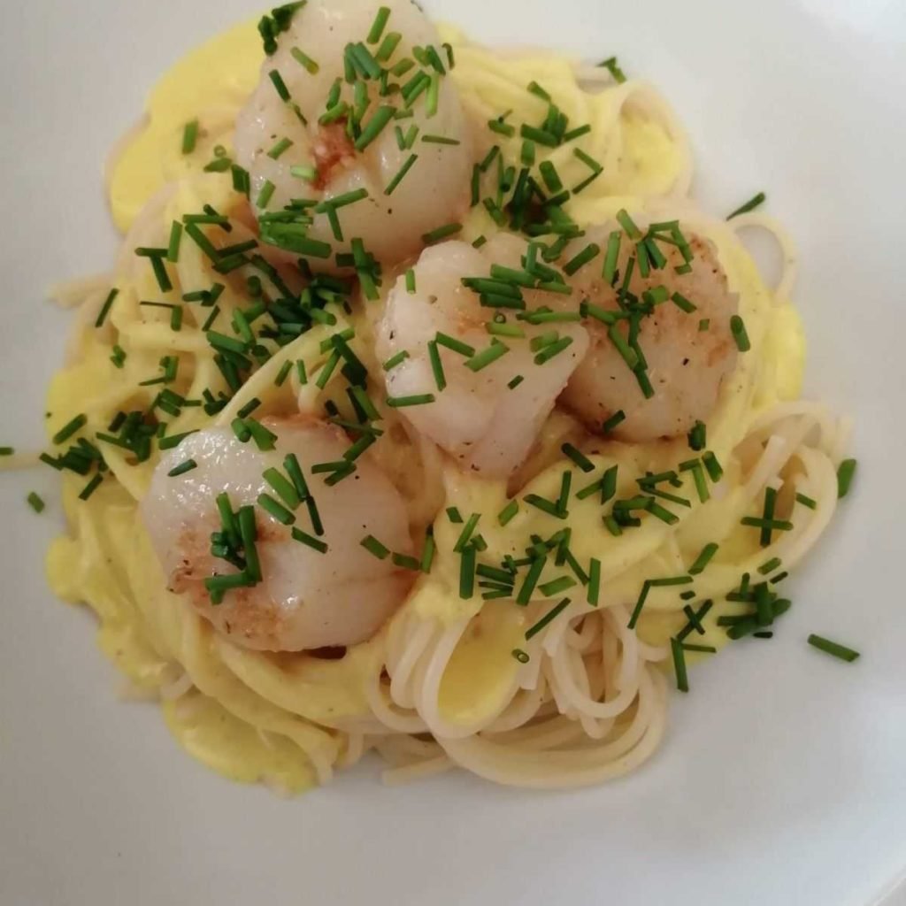 Pasta met Sint-Jakobsvruchten en curryroomsaus