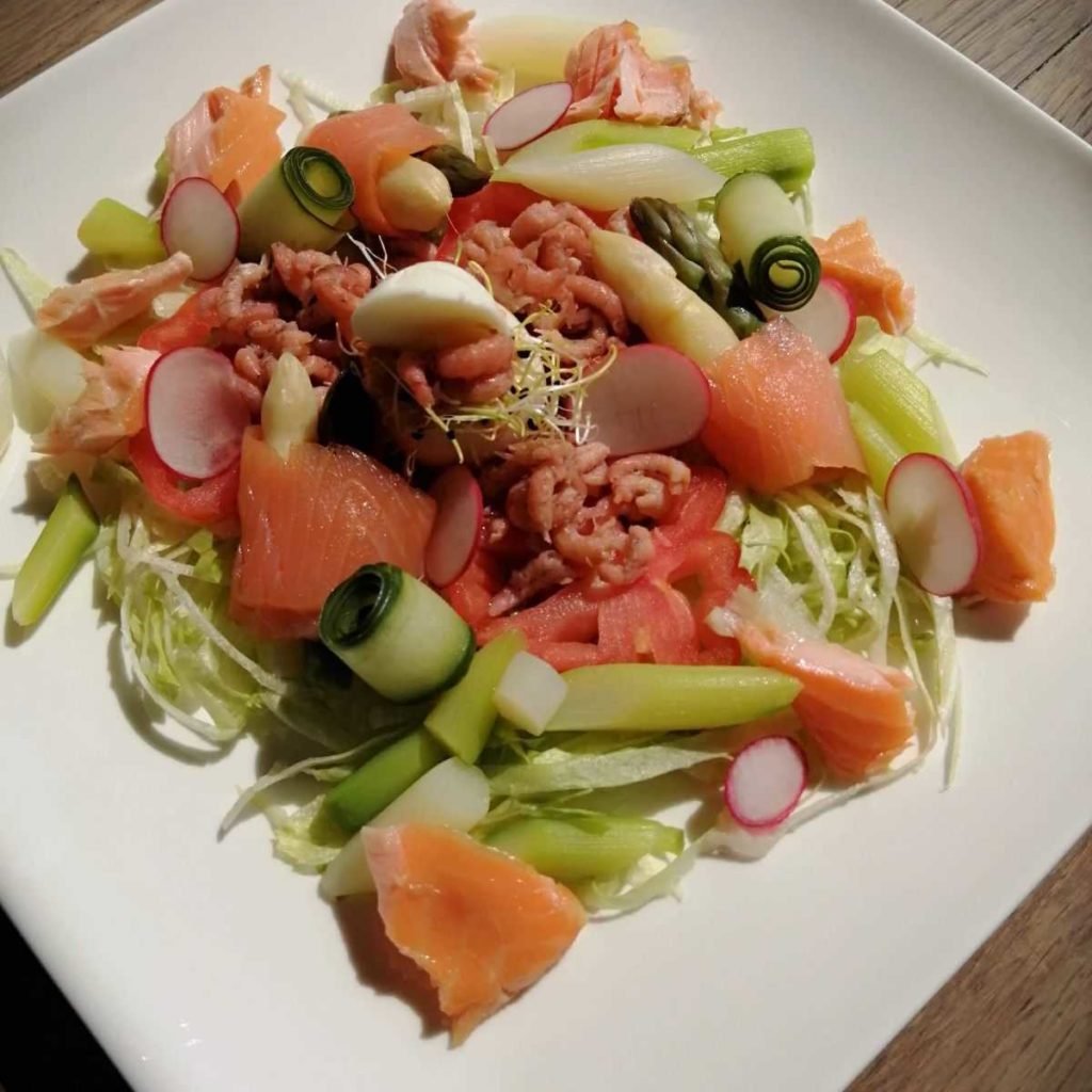 Salade met gerookte zalm, warm gerookte zalm en garnaaltjes