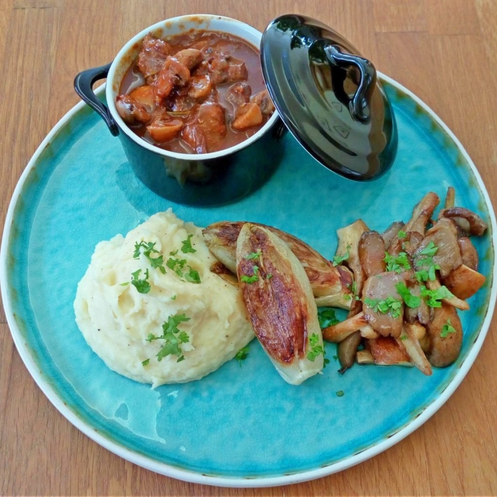 Everzwijnragout met pastinaakpuree, witloof en bospaddenstoelen