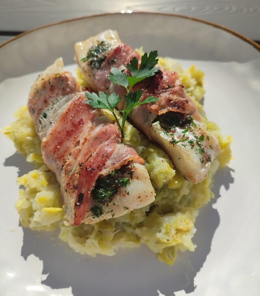 Kruidige kabeljauw in een spekjasje en prei-puree