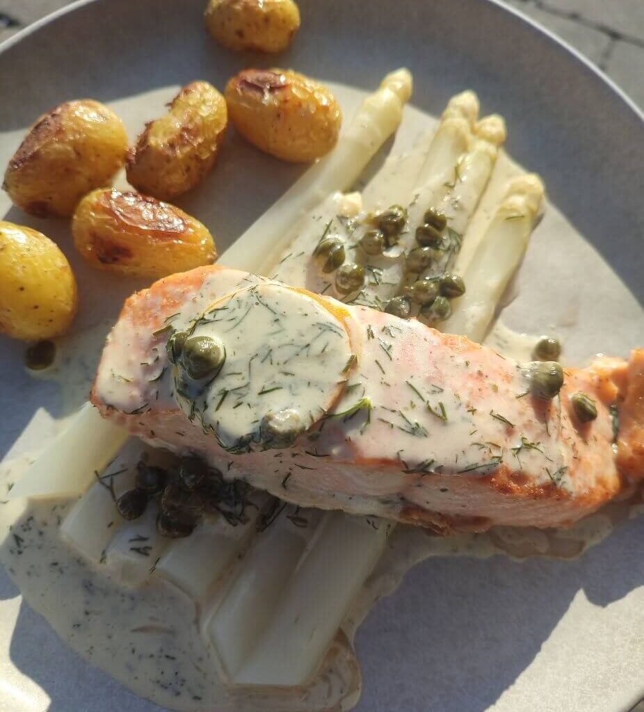 Zalm op een bedje van asperges met een dille-roomsausje