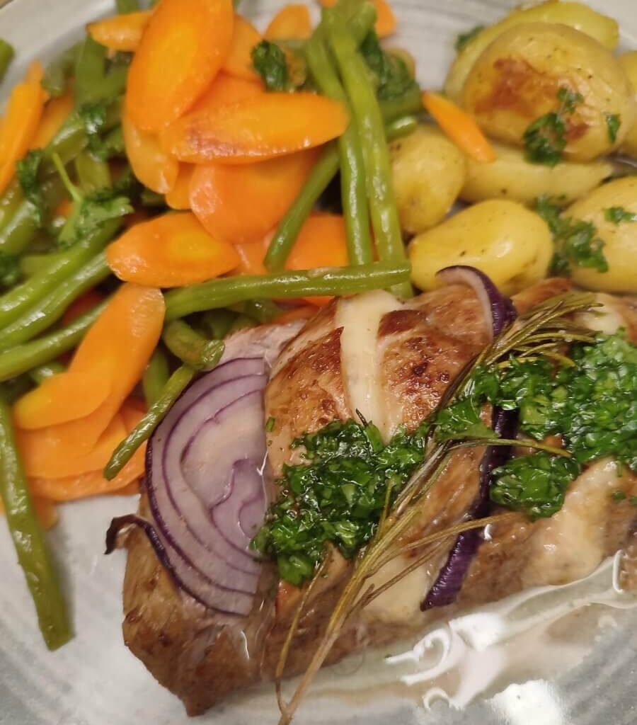 Hasselback varkenshaasje met lentegroentjes in de wok
