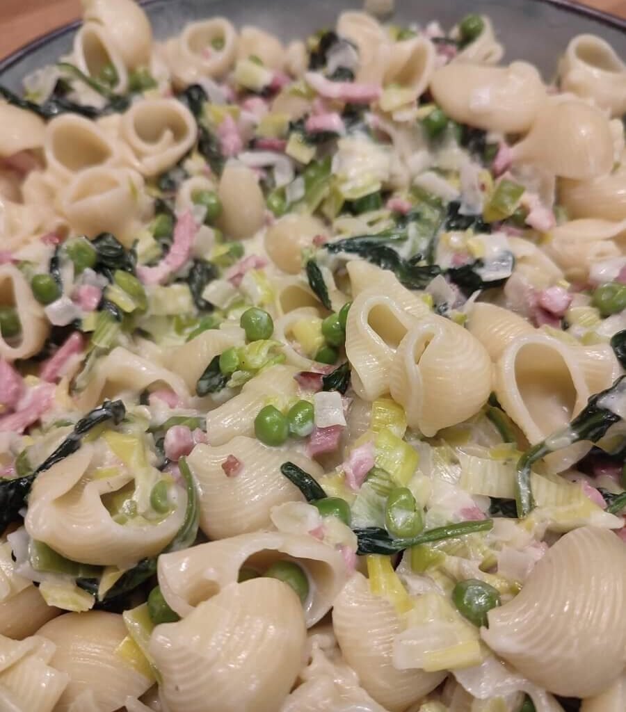 Pipe rigate met groene groentjes en zure room