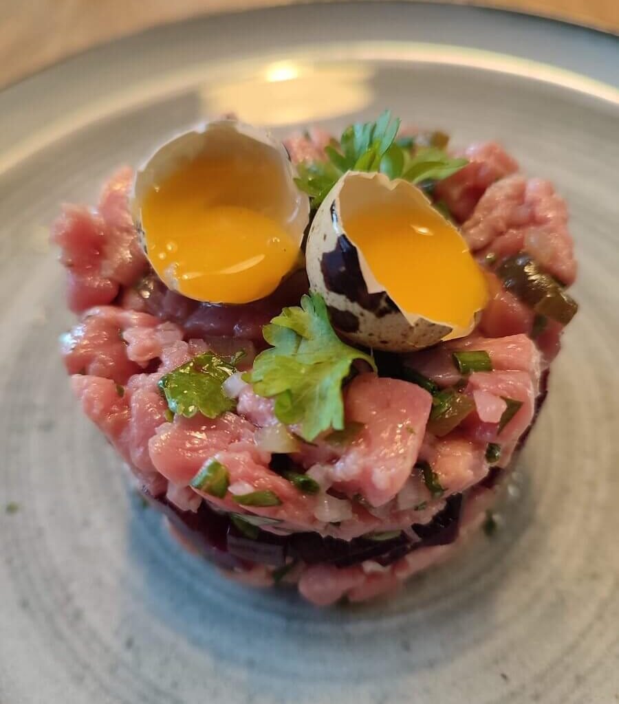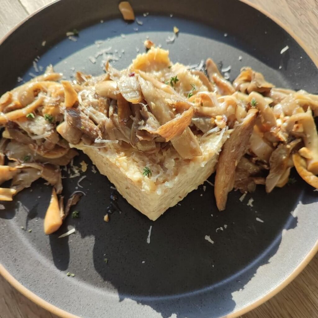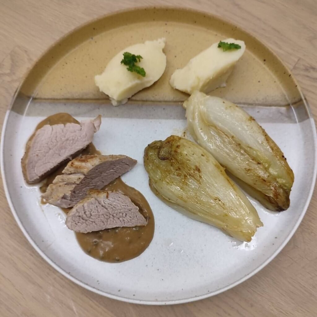 Kotelet met gekookte aardappelen en gegratineerde spruitjes