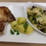 - Zet op elk bord een kommetje spruiten, een kotelet en enkele gekookte aardappelen. Werk af met wat peterselie.