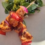 - Serveer de salade met de kip brochettes mooi op een bord.