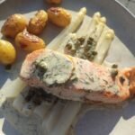 9. Verdeel de asperges en de krieltjes over twee borden. Leg de zalm op de asperges en werk af met de saus.