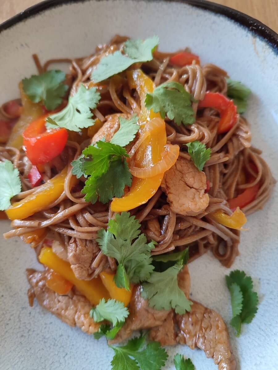 Sobanoedels met zoete chilisaus en varkenshaasje