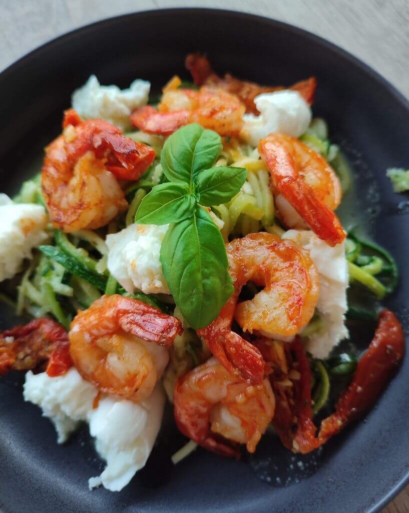 Courgetti met pesto en scampi’s