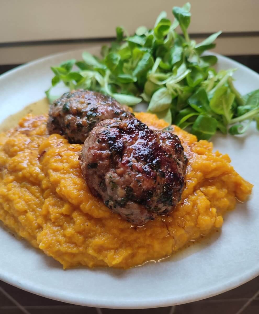 Puree van wortel en zoete aardappel met kruidige hamburgers