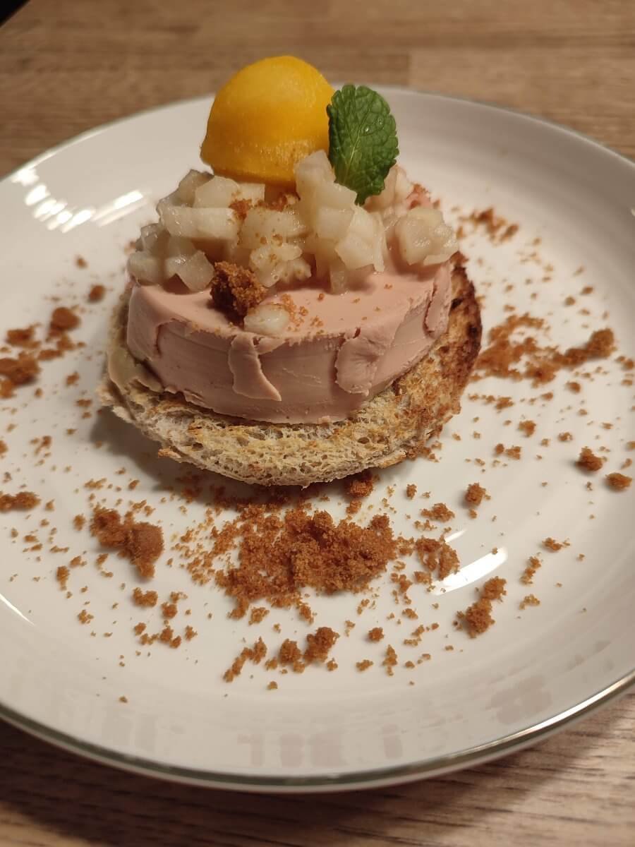 Toast met foie gras, gebakken peer en kaki