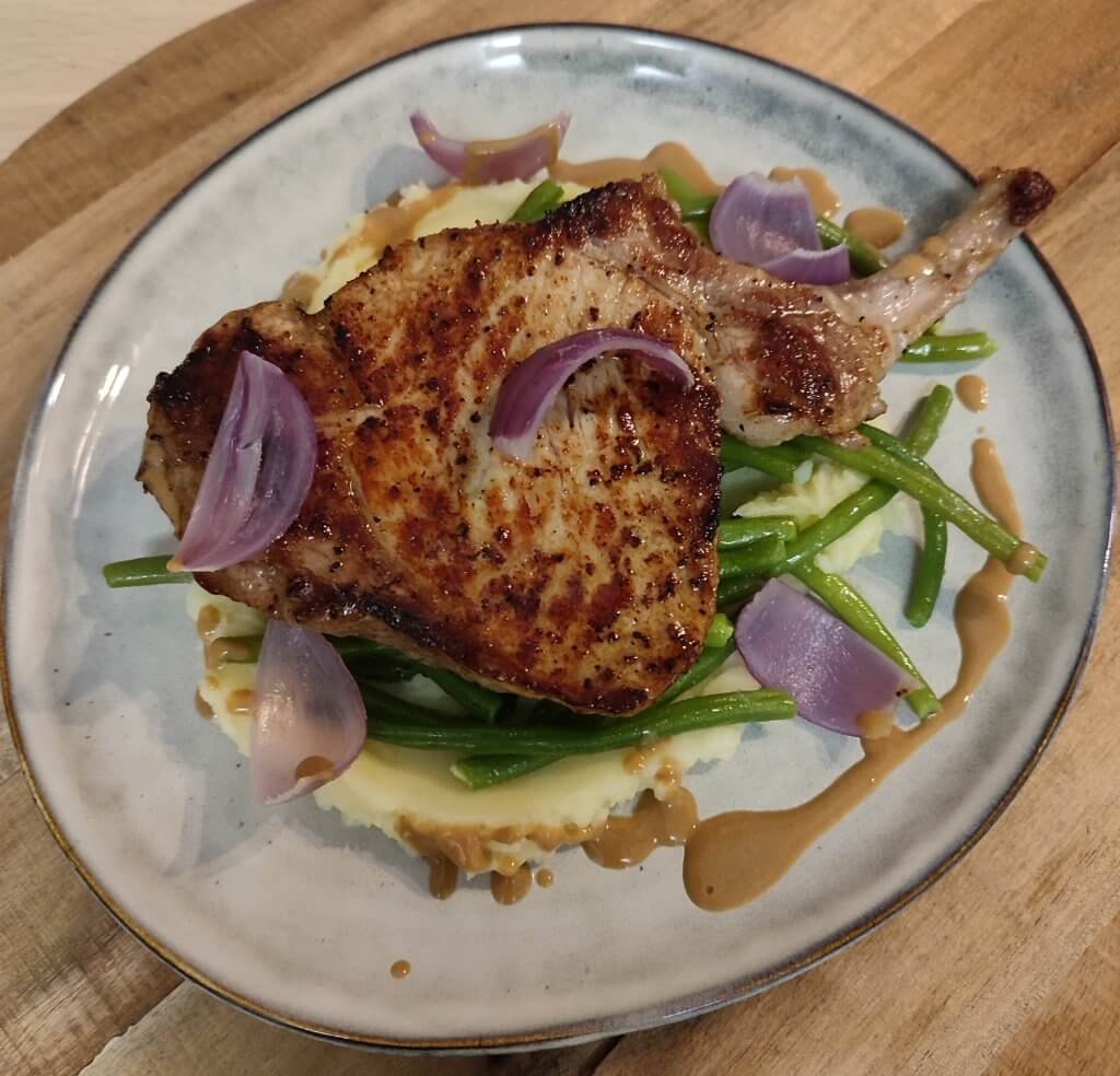 Cote à l’os van varken, fijne boontjes en karnemelkpuree