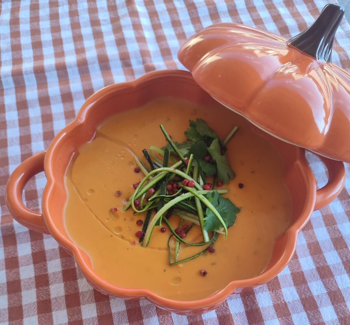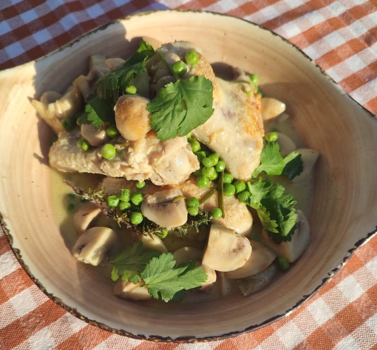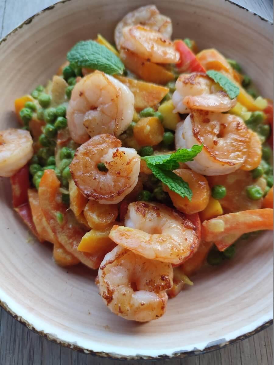 Curry met scampi’s, erwtjes, paprika, mango en munt